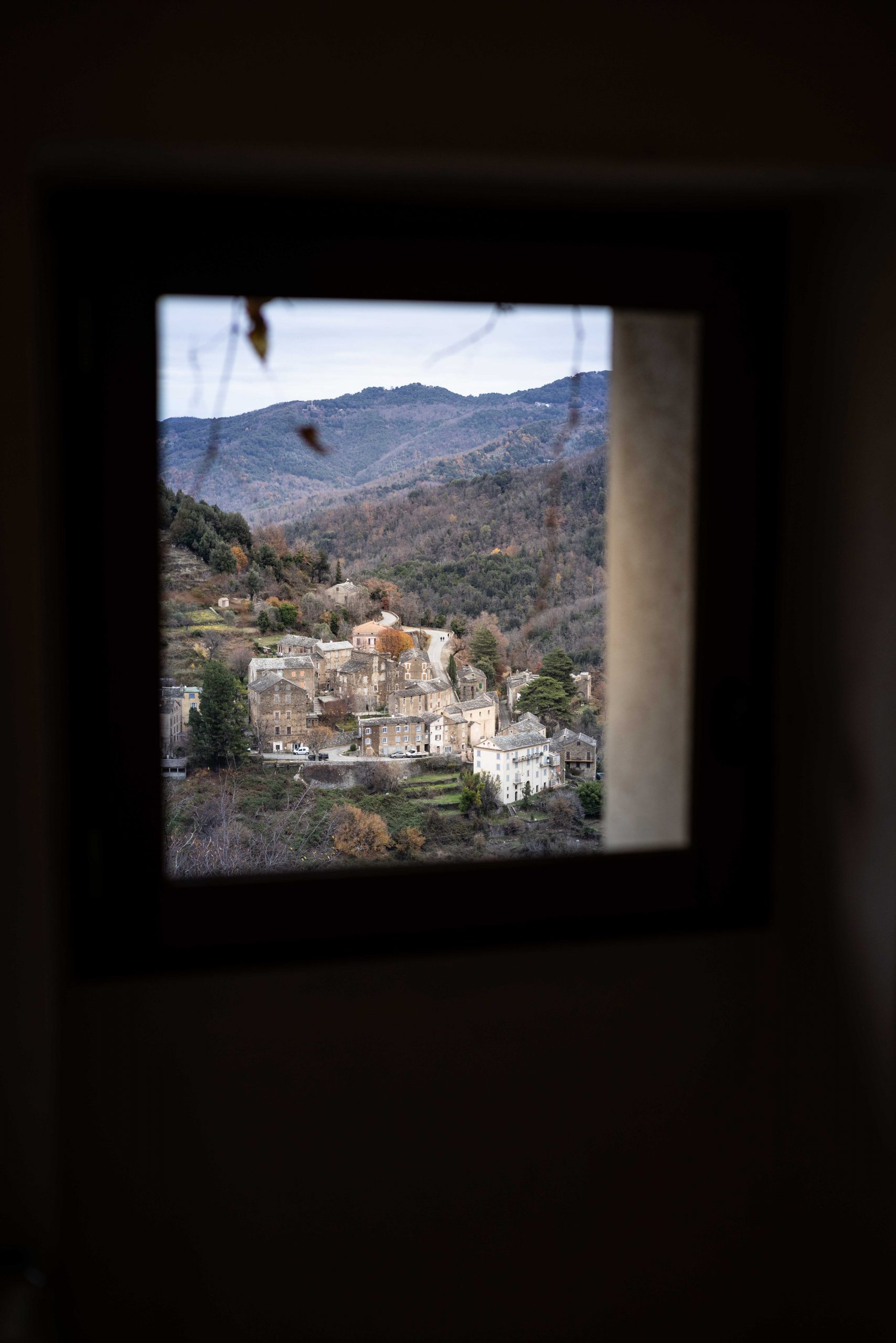 Vue dominante sur le village de Stazzona, sur le mont San Pedrone et la forêt.
